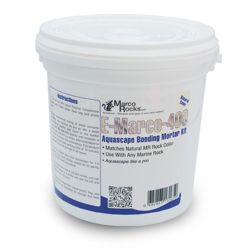 The kit includes everything you will need to create your own mortar that is specially modified to keep the joints from becoming brittle in saltwater. The cement, once mixed will turn into a paste-like consistency that you can then use to bond live rock together to create a permanent, long-lasting bond. Using a cement mortar can have its advantages over other adhesives, most notably the way coralline algae spreads onto the rocks. Many types of glues, epoxies, and other polymer based adhesives will actually repel coralline algae coverage, where MarcoRocks E-Marco-400 allows the algae to grow naturally making the seams disappear much faster than other methods.