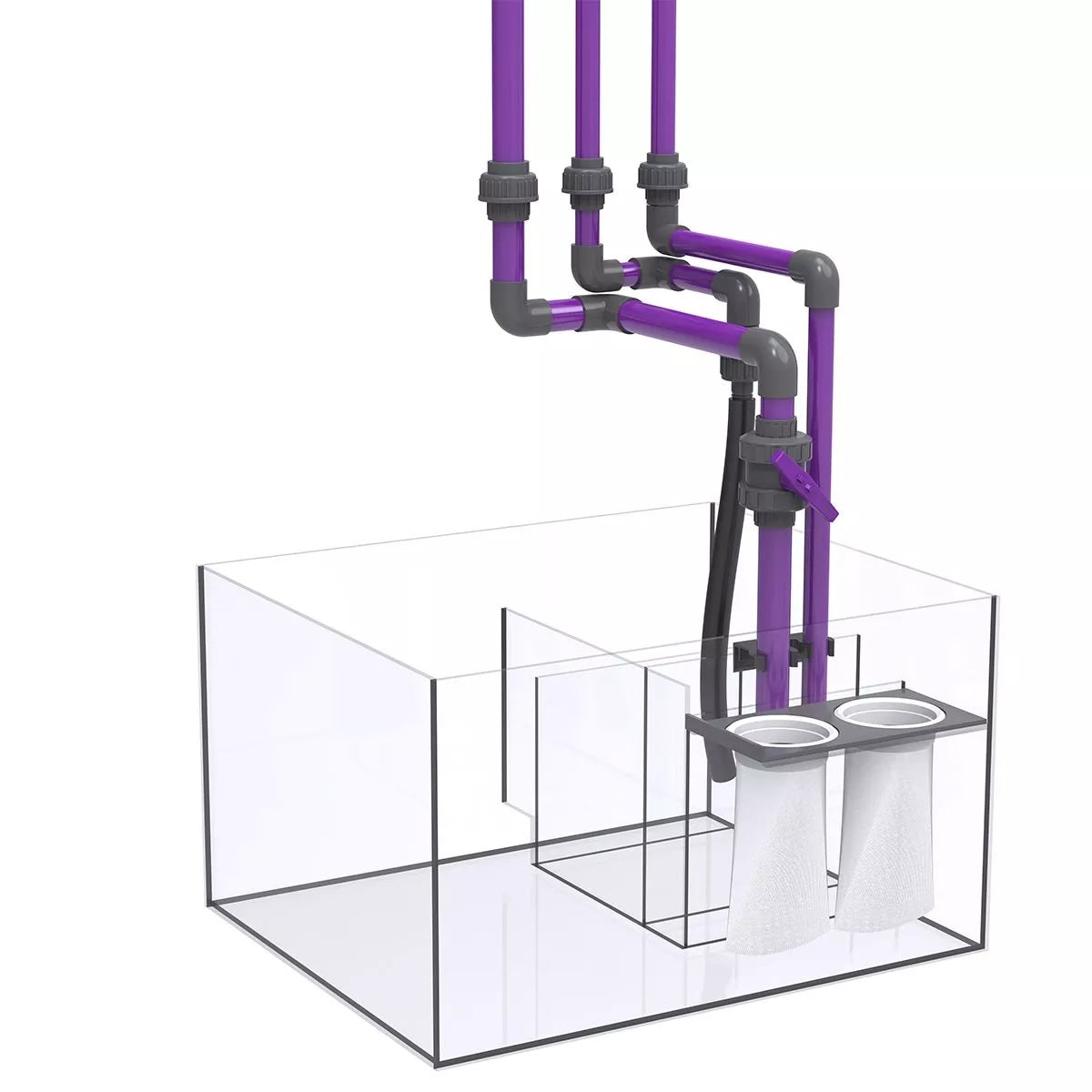 The sump included is simple, yet highly flexible. Nylon filter sock(s) are included to remove larger debris or uneaten fish food. In the second chamber, you'll find room for multiple devices such as a skimmer, media reactor, or algae reactor. With a constant water level of approx. 8", it's ideal for most protein skimmers.